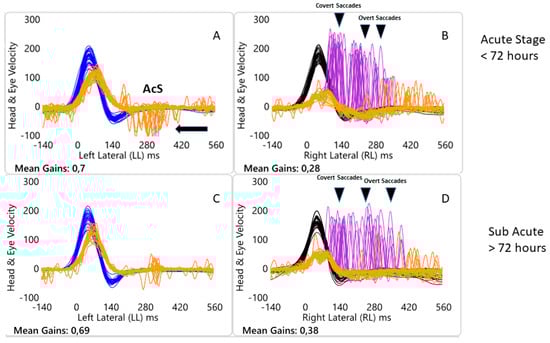About this phenomenon, AcS presence could be associated, in our opinion, as a sign of peripheral deficit due to the contribution to the process of the quick eye movements linked to the failure of the affected side to contribute to the desired realization of the reflex. These saccadic movements are in the same direction of the head movement and it has been previously hypothesized that they are an indicator of peripheral injury []. Last but not least, considering our sample, we can hypothesize that this phenomenon could be an indicator of acute peripheral injury in the very early stages of the inflammatory process.