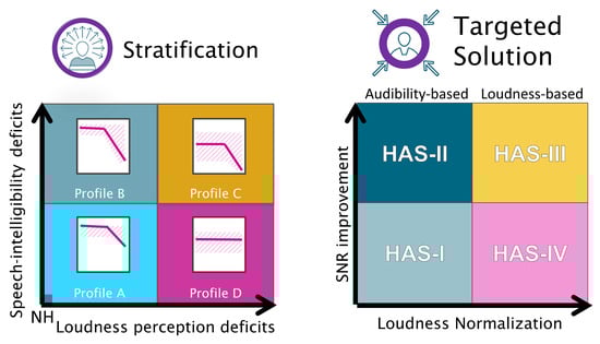 Figure 1 depicts the proposed stratification (left panels) in the four auditory profiles as a summary of Sanchez-Lopez et al. [] and the proposed targeted solution (right panels) associated with each of the auditory profiles. Profile A corresponds to a gently sloping high-frequency hearing loss ( < 50 dB HL), with only mild or no SI and LP deficits. The targeted solution for Profile A is HAS-I, which corresponds to a gain prescription that is based on audibility maximization [] and priority for good sound quality. Profile B corresponds to a high-frequency sloping hearing loss ( > 50 dB HL) with SI and temporal resolution deficits. The targeted solution for Profile B is HAS-II, which corresponds to a gain prescription that is based on audibility maximization and SNR improvement. In HAS-II, the use of fast-acting compression and noise reduction might compromise sound quality, but, nonetheless, this solution is expected to provide the most benefit for listeners that belong to Profile B. This is in agreement with the findings of [], where fast-acting compression provided a systematic audibility benefit. Profile C corresponds to audiometric thresholds >30 dB HL at low frequencies and >50 dB HL at high frequencies, and with SI, LP, spectro-temporal resolution, and binaural-processing deficits. The targeted solution for Profile C is HAS-III, which corresponds to a gain prescription based on loudness normalization [] and SNR improvement. Because SI is a priority for this profile, aggressive noise reduction and directionality settings might be beneficial for Profile C, even if this compromises sound quality and spatial hearing. Profile D corresponds to a nearly flat hearing loss with audiometric thresholds > 30 dB HL across frequencies, with the only supra-threshold auditory deficit being loudness ecrruitment. The targeted solution for Profile D is HAS-IV, with a gain prescription that is based on loudness normalization and no SNR improvement.