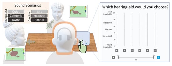 Illustration of the multi-comparison assessment. Left: sketch of the used sound scenarios. The listeners were engaged in a simulated scene consisting of a dialog between two talkers in a quiet or noisy environment. The conversation revolved around finding differences between two Diapix figures []. Three sound scenarios and three speech levels or SNRs were used. Right: graphical user interface of the SenseLabOnline software. The four candidate settings were tested in a multi-comparison paradigm that also included a hidden anchor and reference setting (HAS-O). The sound corresponding to a given setting was played back in a loop when the corresponding play button was pressed. The preference judgements were provided using the sliders. The listeners were instructed to (1) identify the anchor, (2) provide a first set of coarse preference ratings between “Acceptable” and “Not good”, (3) reorganize their ratings using the built-in ranking functionality in the SenseLabOnline software [], and (4) listen to all stimuli again and refine their ratings before storing the final judgements. For each sound scenario, three repetitions per listener were made.