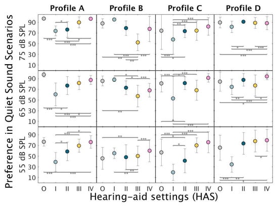 Mean preference ratings for the evaluated HAS (O-IV) in the “Quiet” sound environment across three level conditions: 55 dB SPL (bottom panels), 65 dB SPL (middle panels) and 75 dB SPL (top panels). The circles represent the mean of the scores of the three repetitions performed by the listeners belonging to profile A (left), B (mid-left), C (mid-right), and D (right). Error bars show ±1 standard deviation. Significant differences according to a linear mixed model (Appendix A) analysis followed by Tukey’s honest significant differences tests are marked by asterisks. (***) p < 0.0001, (**) p < 0.001, (*) p < 0.01.
