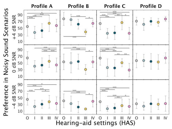 Mean preference ratings for the evaluated HAS (O-IV) under noisy conditions across the three SNR conditions: −4 dB SNR (bottom panels), 0 dB SNR (middle panels) and +4 dB SNR (top panels). Each circle represents the mean of the scores of the three repetitions performed in each noisy sound scenario (traffic and cafeteria) by the listeners belonging to profile A (left), B (mid-left), C (mid-right), and D (right). Error bars show ±1 standard deviation. Significant differences according to a linear mixed model (Appendix A) analysis, followed by Tukey’s honest significant differences tests are marked by asterisks. (***) p < 0.0001, (**) p < 0.001, (*) p < 0.01.