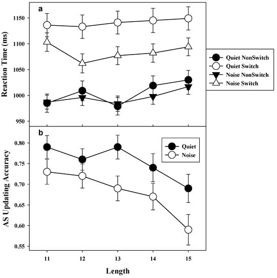 One finding that was apparent in both the AS and WM data was that adding fluctuating background noise significantly increased the speed of processing. This increase in speed of information processing had very different outcomes on accuracy of AS updating and WM recall. The reason for increased processing speed in the presence of noise may be attributed to the energetic/arousal theory of noise [74,75,76]. According to this theory, noise increases the arousal state of an individual [75,77]. Examples of physiological evidence of arousal in noise include increased skin resistance, pulse rate, muscle tension, etc. [78]. One of the important findings with regard to arousal and its relation to cognitive performance was the Yerkes–Dodson Law [79]. According to the Yerkes–Dodson Law, arousal and cognitive performance are related with an inverted U-shaped function and the improved performance range with increase in arousal varies with the complexity of the task. According to this, individuals’ performance is best at some arousal level and the performance falls above or below that optimal state. This optimal arousal state varies depending on the complexity of the task. Increase in arousal level also tends to be associated with reduced response criteria, which might lead to faster, but inaccurate responses [74]. According to Posner and colleagues [80,81], increased arousal/alertness does not affect the quality of decision making during a task, but it does increase the speed at which the decision is reached. Researchers [82] have studied the perception of subjects’ own response time in the presence of noise. Effect of loud noise on subjects’ choice RT and their own judgments were compared. Interestingly, subjects described their RT to be slower, whereas, actually, their RT was significantly faster in the presence of noise. Increased speed of processing or decision-making in the presence of noise reported in previous studies was consistent with the results of the present study; both switch RT in the AS task and processing RT on the WM task were quicker in noise than in quiet condition. This may be attributed to participants’ increased arousal/alertness in the presence of noise leading to faster information processing during these tasks. Furthermore, the results of the present study are consistent with the load theory of attention and cognitive control [83,84], which suggests that in the presence of an irrelevant distractor, individuals’ focus of attention depends on the information load in the relevant task. Hence, the improved performance in AS switch RT and WM accuracy found in the presence of non-informational noise may suggest increased efficiency of the attention mechanism.