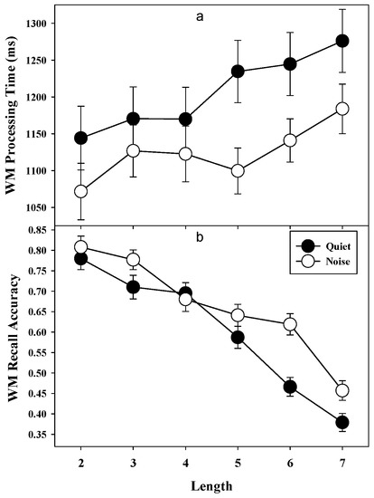 In real-life, we perform a variety of cognitive tasks such as, reasoning, writing, reading, and listening in the presence of interfering background noise. Considerable evidence supports that background noise/sounds have a detrimental effect on cognitive task performance, such as verbal short-term memory and reading comprehension [1,2,3,4]. Often this effect of noise or sound is discussed in terms of cross-modal distraction, called irrelevant sound effect (ISE). Serial recall is one of the most commonly used tasks to study the ISE and findings from a vast body of literature suggest that serial recall of visually presented stimuli is impaired in the presence of sound, irrespective of whether the sound is presented during the presentation of “to be remembered” stimuli, or during the retention interval before recall [5,6,7,8]. One critical factor that determines the magnitude of ISE is whether irrelevant sound is static or changing. Thus, a sequence of changing sounds such as “ba, da, ba, ka, ba, ta,…” produces greater disruption to serial memory recall compared to a sound sequence that does not change “ba, ba, ba, ba, ba, ba,…”. Jones and colleagues proposed the “changing state hypothesis” to account for ISE [1]. According to this hypothesis, change in the irrelevant sound is the key feature that disrupts serial recall. Changing state effect is mainly seen if the task requires recall of items in strict serial order, but not when asked to recall freely in any order [1,9,10,11]. The meaning of irrelevant sound has been found to have no effect on serial recall performance [1,12,13,14]. However, semantic information in irrelevant sound can significantly disrupt language-based tasks, such as reading comprehension [3,4,15], reasoning [16], and writing [17]. This effect of ISE is also known as semantic interference or informational masking in the speech perception literature. Changing state effect and semantic interference is thought to reflect auditory distraction caused by interference-by-process. According to this view, auditory distraction arises due to a conflict between contemporaneous processes; one that is applied automatically to the irrelevant sound stream and a deliberate process applied to the focal task material [2,11]. Several findings suggest that low level of noise may enhance arousal levels, leading to faster and better hearing performance [18,19,20].