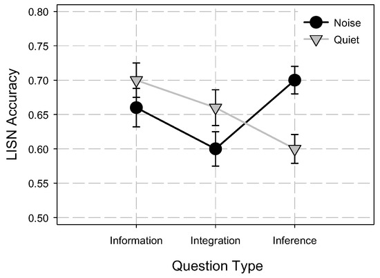 Listening comprehension was measured using extended spoken passages in quiet and in the presence of fluctuating ICRA noise. Participants’ comprehension was measured for information, integration, and inference question types. The results of the present study in quiet were consistent with the original published LISN test data [72]. Listeners performed best on information questions followed by integration questions and poorest on inference questions in quiet condition. However, the most intriguing finding of the present study was in the noise condition. Contrary to listening comprehension performance in quiet, listeners’ performance in the presence of noise was best on inference questions than on information or integration questions. Listeners’ performance for inference questions was significantly better in noise than in quiet condition (Figure 3). Several studies have shown that making inferences during reading and listening relies heavily on WM [89,90,91,92]. Researchers [93] who have explored the relationship between WM capacity and reading comprehension in 206 participants have argued that, the reason WM capacity predicted complex cognitive activities, such as reading comprehension, was because the storage and processing capacity of WM is important for retaining new information, making inferences, and integrating new information with the knowledge from LTM. In the present study, participants’ recall on both WM tasks were significantly better in noise than in quiet, which suggested that participants might have been able to utilize the increased WM capacity to their advantage in answering the inference questions in noise. That is, improved performance for inference questions in noise may be attributed to increased/better WM deployment in the presence of noise.