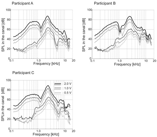 Sound pressure level (SPL) in the canal when the transducer is attached to the tragus (—) and unattached (- - -). The black, dark gray, and gray lines indicate input voltages of 2.0, 1.0, 0.5 V, respectively. (Figure 2 was originally presented in Shimokura et al. 2014, Figure 6 [13]).
