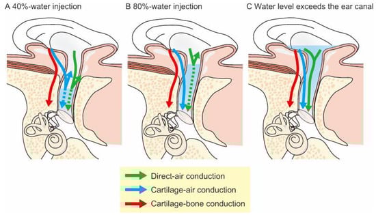 Effects of ear canal water injection on the transmission pathways. (A) The water stays within the bony portion of the ear canal, interrupting direct- and cartilage–air conduction. (B) The water enters the cartilaginous portion of the ear canal, avoiding an impedance mismatch between air and water in the cartilage-AC pathway. (C) The water level exceeds the ear canal, allowing for direct water vibrations. (Figure 3 was originally presented in Nishimura et al. 2015, Figure 1 [11]).