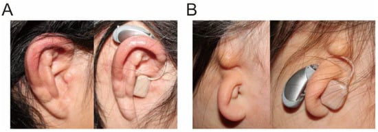 Examples of ears with and without cartilage conduction hearing aid (CC-HA). Some patients wear CC-HA in the same manner as conventional behind-the-ear hearing aids (A). For other patients, double-sided tape is needed for fixation of the hearing aids (B). (Figure 5 was originally presented in Nishimura et al. 2018, Figure 1 [40]).