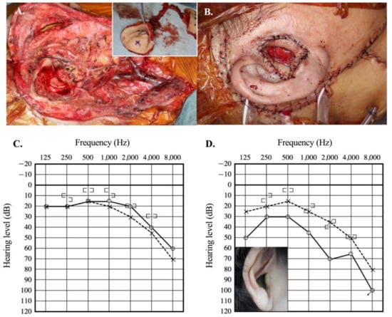 Reconstruction of the external auditory canal after lateral temporal bone resection. (A) Surgical view of completed lateral temporal bone resection. An inset shows the harvested free anterolateral thigh flap, which is rolled to create the external auditory meatus. (B) Final view after reconstruction of the external auditory meatus. (C) Preoperative pure-tone audiometry (Case 1) (D) Postoperative pure-tone audiometry one year after surgery (Case 1). Inset shows the reconstructed auditory canal in Case 1.