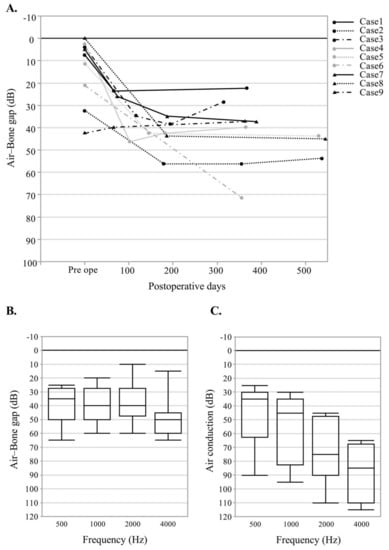 Audiometry with a pure-tone audiometer (AA-76, AA-78, AA-79; Rion, Kokubunji, Japan) was conducted in a soundproof booth by experienced audiologists. Pure-tone thresholds were measured at 0.125, 0.25, 0.5, 1, 2, 4, and 8 kHz frequencies for air conduction and at 0.25, 0.5, 1, 2, 4 kHz for bone conduction with masking as appropriate. The results of both preoperative and postoperative hearing thresholds are included in our dataset. The hearing level was evaluated based on pure-tone audiograms as a follow-up to postoperative hearing levels in patients with auditory canal reconstruction. Pure-tone air and bone conduction thresholds averages were obtained. For pure-tone averages, the thresholds measured were 0.5, 1, 2, and 4 kHz. Air-bone gaps (ABGs) were calculated using air and bone conduction averages from the same test. To test the hearing level in patients that underwent surgery with the bone–cartilage anchoring technique, ipsilateral pure-tone hearing thresholds were tested while the patients wore commercial CCHAs (HB-J1CC, Rion) with appropriate masking for the contralateral side. We calculated and averaged the difference between the aided sound field thresholds and bone conduction thresholds at 0.5, 1, 2, and 4 kHz, which is referred to as “aided ABG.”