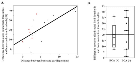 Effectiveness of the cartilage conduction hearing aid in cases after lateral temporal bone resection. (A) The relationship defining the distance between the auricular cartilage and the temporal bone and the difference between the aided sound field and bone conduction thresholds in 16 cases with the cartilage conduction hearing aids. Red dots show cases with BCA. (B) Difference between the aided sound field and bone conduction thresholds in 12 cases without external auditory meatus reconstruction. BCA; bone-cartilage anchoring.