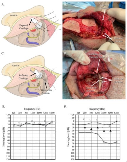 Bone–cartilage anchoring technique (BCA). (A) Auricular cartilage was anchored to the temporal bone with a 3-0 PDS suture (Type 1). (B) Surgical view of the Type 1 bone–cartilage anchoring technique (Case 13). (C) The auricular cartilage was inserted into the created groove of the temporal bone and fixed with a 3-0 PDS suture (Type 2). (D) Surgical view of the type 2 bone–cartilage anchoring technique (Case 12). (E) Preoperative pure-tone audiometry (Case 10). (F) Postoperative pure-tone audiometry of case 10 after the bone–cartilage anchoring technique. The black triangle shows the hearing level with a cartilage conduction hearing aid at a sound field with adequate masking on the contralateral side.