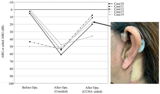 The outcome of the air–bone gap after the bone–cartilage anchoring technique surgery. An inset shows the auricular wearing the cartilage conduction hearing aid (Case 13). The CCHA transducer was fixed to the anterior root of the helix with double-sided tape. The difference between the aided sound field and bone conduction thresholds was represented as an air–bone gap under the CCHA-aided state after surgery. CCHA, cartilage conduction hearing aid; Ope., operation.