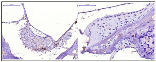 When the therapeutic dose of 5 mg/kg was administered, we observed low HIF-1 expression in the cells of the receptor apparatus and moderate HIF-1 expression in the cells of the spiral ganglion. When the therapeutic dose of 7 mg/kg was administered, we observed moderate HIF-1 expression in the cells of the receptor apparatus and the cells of the spiral ganglion. The pronounced HIF-1 expression was observed after administering the therapeutic dose of 10 mg/kg injected 2 h after the acoustic trauma (Figure 2).