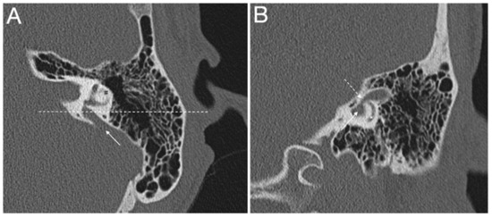 (A,B) Computed tomography of a left temporal bone of a 12-year-old female patient with bilateral enlarged vestibular aqueduct and congenital moderate (left ear) to profound (right ear) hearing loss. Section A: axial plane; arrow is the enlarged vestibular aqueduct; #, lateral semicircular canal; dotted line is the plane of section B. Section B: coronal plane; continuous arrow is the enlarged vestibular aqueduct; dotted arrow is the isthmus of the enlarged vestibular aqueduct; *, posterior semicircular canal. The patient harbors biallelic pathogenic variants (c.1301C > A; p.A434D and c.1730T > C; p.V577A) in the SLC26A4 gene, which were described in [43].