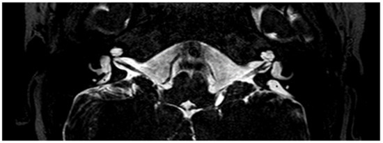 Magnetic resonance imaging of the temporal bones of the same patient shown in Figure 2, T2-weighted. A bilaterally enlarged endolymphatic duct can be observed. *, enlarged endolymphatic duct.