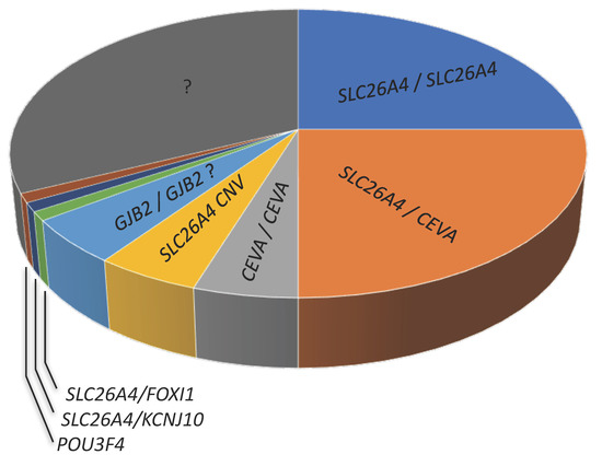 Approximate proportion of genetic determinants (first allele/second allele) of hearing loss and EVA in Caucasian cohorts. CEVA, Caucasian enlarged vestibular aqueduct haplotype; CNV, copy number variation; ? indicates a controversial finding or undetermined feature.