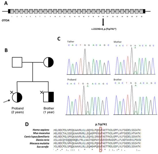 Targeted NGS analysis performed on patient’s DNA revealed a heterozygous nonsense c.2223G>A variant located in the exon 20 of OTOA, which is predicted to incorporate a premature termination codon (PTC) [p.(Trp741*)] (Figure 2A). No further clinically relevant variants were detected in the remaining genes included in the panel. The c.2223G>A, p.(Trp741*) variant is not reported in major databases, including dbSNP, ExAC, 1000 Genomes and gnomAD. This suggests that the variant represents a rare event. The result was confirmed by direct Sanger sequencing of proband’s DNA. Segregation analysis in both unaffected parents revealed that this variant was inherited from the mother. The heterozygous variant was also identified in the affected brother (Figure 2B,C). Computational analysis predicted the pathogenic effect of the novel change which occurs in an evolutionarily conserved region (Figure 2D). According to the ACMG guidelines, the variant was classified as pathogenic by the attribution of the following criteria: PVS1_very strong, PM2_moderate and PP1_supporting [7].