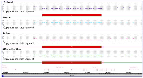 In search of a second deleterious variant in OTOA in the proband and affected brother, high-resolution single nucleotide polymorphism-array (SNP-array) analyses of the proband, her brother and parents were executed using the CytoScan HD Array (Thermo Fisher Scientific, Waltham, MA, USA), as previously described [9]. This array contains more than 2.6 million markers for copy number variation (CNVs) analysis and approximately 750,000 SNP probes capable of genotyping with an accuracy greater than 99%. Data analysis was performed using the Chromosome Analysis Suite Software version 4.2 (Thermo Fisher Scientific, Waltham, MA, USA) following a standardized pipeline. Briefly: (i) the raw data file (CEL) was normalized using the default options; (ii) an unpaired analysis was performed using as baseline 270 HapMap samples in order to obtain copy numbers value, while the amplified and/or deleted regions was detected using a standard Hidden Markov Model (HMM) method. We retained CNVs >15 Kb in length and overlapping >10 consecutive probes to reduce the detection of false-positive calls. The significance of each detected CNV was determined by comparing all chromosomal alterations identified in the patient with those collected in an internal database of ~5000 patients studied by SNP arrays since 2010, and public databases including Database of Genomic Variants (DGV), DECIPHER, and ClinVar. Base pair positions, information about genomic regions and genes involved by CNVs, and known associated diseases have been derived from the University of California Santa Cruz (UCSC) Genome Browser, build GRCh37 (hg19). The clinical significance of each rearrangements detected has been assessed following the ACMG guidelines for CNVs reporting [10,11].