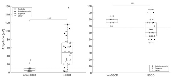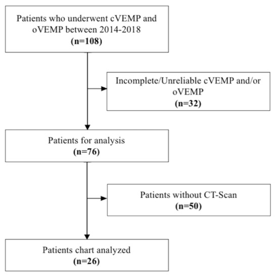 - Hunter, J.B.; Patel, N.S.; O’Connell, B.P. Cervical and Ocular VEMP Testing in Diagnosing Superior Semicircular Canal Dehiscence. Otolaryngol. Head Neck Surg. 2017, 156, 917–923. [Google Scholar] [CrossRef] [PubMed]