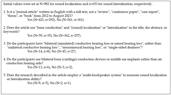 The present review aimed to discuss the factors affecting sound localization or lateralization, as well as their accuracy, for persons with bilateral (simulated) CHL using bilateral devices. For the first aim, the factors affecting sound localization and lateralization were classified, and the relevant research is discussed. For the second aim, regarding the accuracy of sound localization and lateralization using a multi-loudspeaker system, rather than a questionnaire such as “The Speech, Spatial and Qualities of Hearing Scale (SSQ) [20], the clinical literature related to persons with hearing loss or normal hearing was searched on “Google Scholar”. The keywords for this search were “bone conduction”, “localization”, “bilateral”, and “conductive hearing loss” for sound localization, and “bone conduction”, “lateralization”, “bilateral”, and “conductive hearing loss” for sound lateralization. The search was performed for literature from 2012 to August 2021 because Janssen et al. (2012) [12] had already reviewed the literature from 1977 to 2011. The strategy used to select the literature for the second aim was as follows.