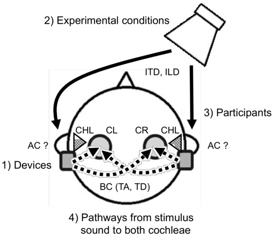 Sound localization by binaural hearing with devices is mainly mediated by two pathways: (1) the pathways from the sound source to the microphones of the bilateral devices, and (2) the pathways from the bone-conducted sound induced by both devices to both cochleae (Figure 2).