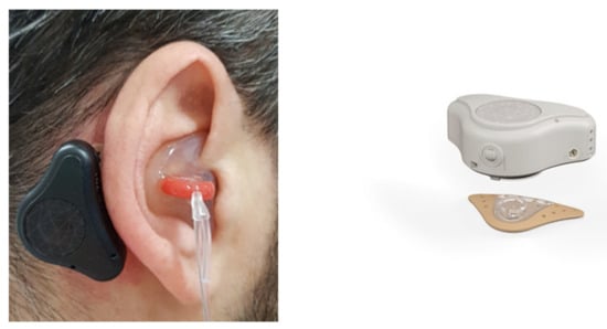 - Kuthubutheen, J.; Broadbent, C.; Marino, R.; Távora-Vieira, D. The Use of a Novel, Nonsurgical Bone Conduction Hearing Aid System for the Treatment of Conductive Hearing Loss. Otol. Neurotol. 2020, 41, 948–955. [Google Scholar] [CrossRef] [PubMed]