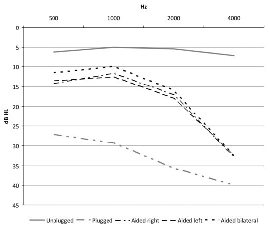 There was a statistically significant main effect of condition and frequency for the studied audiometry thresholds (two-way ANOVA; p < 0.0001). Post-hoc analysis showed a statistically significant difference between the unplugged and plugged conditions, between the plugged and each aided condition, and also between the unplugged and each aided condition (Tukey’s test; p < 0.01). No statistically significant differences were found between the three different aided conditions (Tukey’s test; p > 0.05). Although there was no difference between the thresholds at each of the frequencies in the unplugged condition (Tukey’s test; p > 0.05), there were a statistically significantly higher threshold for 2–4 kHz than 0.5–1 kHz in each study condition (Tukey’s test; p < 0.01). However, there was a statistically significant gain for each frequency in the aided conditions (Tukey’s test; p < 0.01)