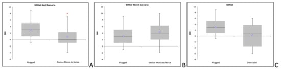 The speech signal consisted of random phonetically balanced lists of 20 spondaic words in the Italian language [] delivered at 50 dB HL, while pink noise was used as a masker. With the aim of evaluating binaural hearing skills, loudness summation and the squelch effect were tested. To evaluate loudness summation, speech and noise were presented from the same loudspeaker located frontally (Figure 2A). For measuring the squelch effect, both conditions were tested with noise from the right side (+90°, Figure 2B) and from the left side (−90°, Figure 2C), while speech was presented from the front. An adaptive procedure with 2 dB increments/decrements of noise starting from a signal-to-noise ratio (SNR) of 10 dB was employed. The speech reception threshold corresponding to 50% of word recognition (SRT50) was taken as the reference target. Overall “best scenario” and “worst scenario” SRT50 scores were those obtained in case of unilateral aid use in the conditions of noise lateralized to the unaided side or to the aided side, respectively. The lower the value of SRT50, the better the hearing performance in noise.
