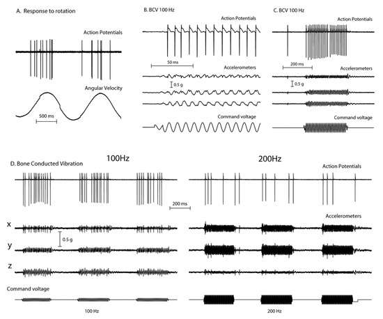 The responses (action potentials) of a primary semicircular canal neuron to low frequency skull vibration. (A) Responses to angular acceleration, demonstrating that this is a semicircular canal neuron. (B) In response to 100Hz vibration, the neuron fires one action potential per cycle and it is phase locked to the stimulus, as shown by the small spikes in the accelerometer records and the very even spacing of action potentials in (C). However, if frequency is increased the neural response decreases (D) even when the vibration intensity is increased (as shown by the smaller response at 200Hz compared to 100 Hz). Reproduced from [2] with permission of Wolters Kluwer Health.