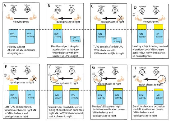 A similar account probably applies in some cases of MD; in the paralytic phase, MD may reduce the response of afferent neurons in the affected ear (and so result in imbalance of VN activity and SVIN with QPs away from the affected ear), but in the irritative phase the disease may enhance the response of afferent neurons [20,21,22] and so result in nystagmus with QPs towards the affected ear. In both SCD and the irritative phase of MD, it is, on this account, an enhanced response which causes the imbalance in neural activity between the two VN and so drives QPs towards the affected ear (Figure 3G).