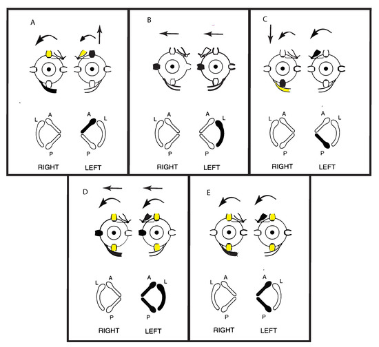 Representations of the direction of eye movements in response to selective electrical stimulation of individual canals (from Cohen, Suzuki, Bender 1964). The point of view of the semicircular canals in the schematic is straight down on the labyrinths. The arrows in these figures show the direction of the slow-phase eye velocity of the eye movement response to electrical stimulation of individual canals. The stimulated canal(s) are shown in black and the main eye muscles generating the eye movement (arrows) are shown as black. The muscles providing a smaller contribution are shown as yellow. (A–C) show the slow phase eye movements induced by stimulation of individual canals. Note that the movements in (A,C) are disconjugate, while those in (B) are conjugate horizontal eye movements away from the stimulated side. (E) shows the effect of simultaneous stimulation of both vertical canals in a labyrinth—generating torsion away from the stimulated ear, with minimal vertical or horizontal components. Simultaneous stimulation of all canals in a labyrinth (D) causes horizontal and torsional eye movements, with minimal vertical components. Reproduced from [5] with permission of Sage.