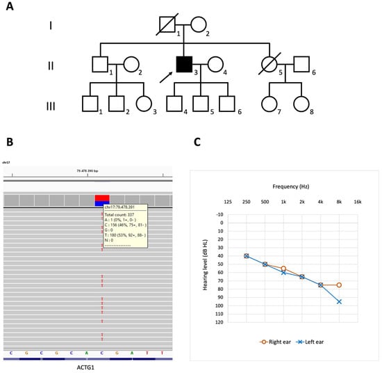 (A) family tree of our patient (II,3). (B) NGS analysis showing the cytosine (C) to thymine (T) substitution at nucleotide 79,478,391 of chromosome 17 [hg19]; this variation corresponds to the c.625G>A variant in exon 4 of ACTG1; it was detected in approximately 50% of the total number of reads (337) at position 79,478,391, indicating a heterozygous genotype. (C) Audiogram of the proband carrying the c.625G>A p.(Val209Met) variant in ACTG1 (at age 57 years).