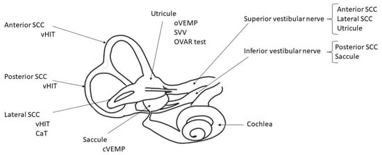 Inner right ear diagram with vestibular structures and their respective tests. CaT: caloric test; OVAR test: off vertical axis rotation test; SCC: semi-circular canal; SVV: subjective visual vertical; VHIT: video head impulse test; VEMPs: vestibular evoked myogenic potential (ocular and cervical).