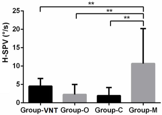 SVIN positivity repartition was not different in the different pathological groups (Fisher exact test: p = 1). However, the value of SVIN-SPV horizontal component measured at 10.7 ± 9.50°/s in Group-M was significantly higher than in the other groups (Kruskal–Wallis test: p = 0.0055). There were no differences among the other groups (Table 2 and Figure 2).