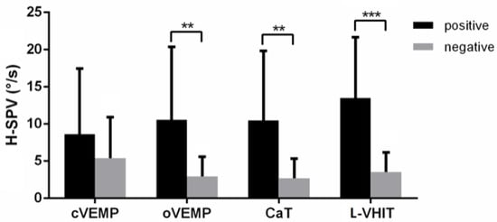 H-SPV bar chart with standard error comparison between positive and negative results of vestibular tests. (**: p < 0.01, ***: p < 0.001).
