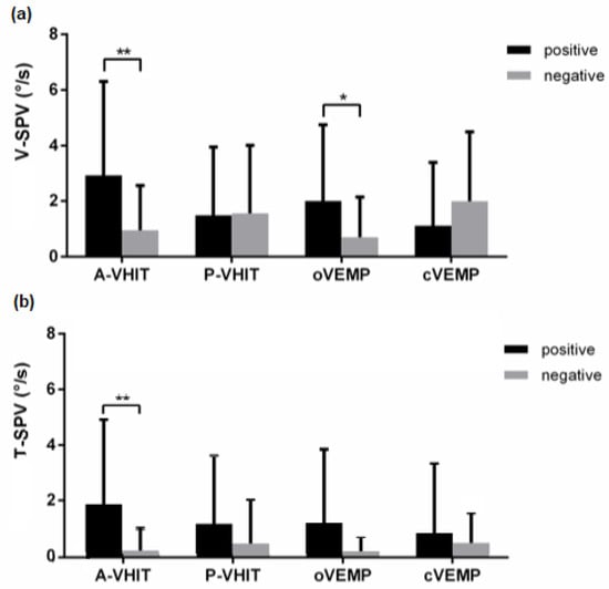 V-SPV (a) and T-SPV (b) bar charts with standard error comparison between positive and negative results of vestibular tests. (*: p < 0.05, **: p < 0.01).