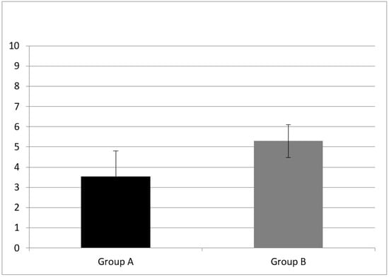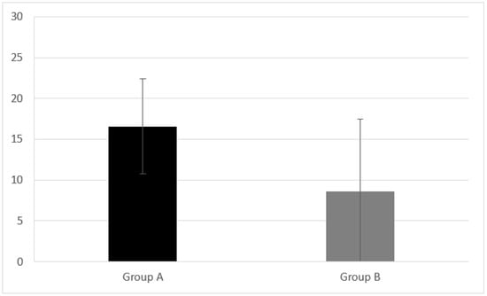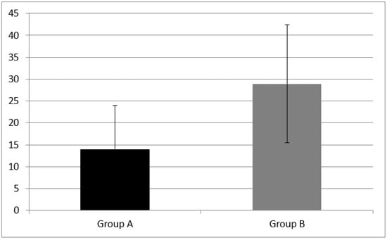 Group A presented inhibition and control of the impulsive response analyzed by CAF equal to 16.59 ± 5.84. Group B had a CAF result of 8.57 ± 8.89 (Figure 3). A statistically significant difference in CAF was found between Group A and B (z = −2.767, p = 0.005).