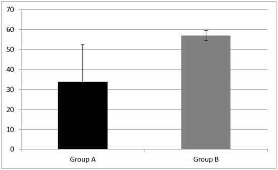 Cognitive flexibility skills measured as categorical fluency in Group A and B. Categorical fluency was equal to 34.00 ± 14 in CI children (Group A) and 57.07 + 18.42 in NH children (Group B). A statistical difference was found (z = −3.15, p = 0.001). Error bars indicate the standard deviation.