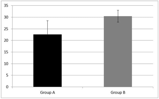 Planning results at subtest of TOL measured as total correct mean in Group A and B. TOL correct score was respectively 22.59 ± 5.85 in Group A and 30.43 ± 2.53 in Group B. A statistical difference was found (z = −3.71, p = 0.00). Error bars indicate the standard deviation.