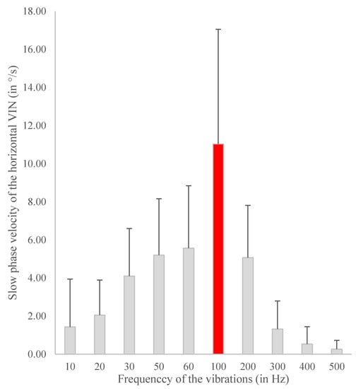 - Frequency consensus: 100 Hz widely used (majority of publications [,,,,,,,,,,,,,,,,,]). The systematic study of frequency optimization, analyzing SVIN SPV in response to 10 Hz up to 800 Hz, performed by Dumas et al. with the Mini-shaker device of B&K has confirmed this optimal frequency empirically accepted by many other authors [,] (Figure 2)