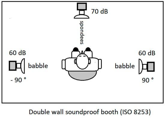 Speech audiometry material contained 5 lists of 20 common two-syllable recorded words, the so-called spondees [37]. The patients were seated in a double wall booth and lists of words were delivered by a loudspeaker directly in front of the subject, one meter from their head at a fixed level of 70 dB (A). A ten-speaker multi-talker speech babble was used as the competing noise and delivered by two loudspeakers positioned at 90° degrees on each side of the patients (Figure 1). The spectrum of multi-talker babbles was speech shaped [38]. A signal-to-babble ratio of +10 dB [39,40] was adopted.