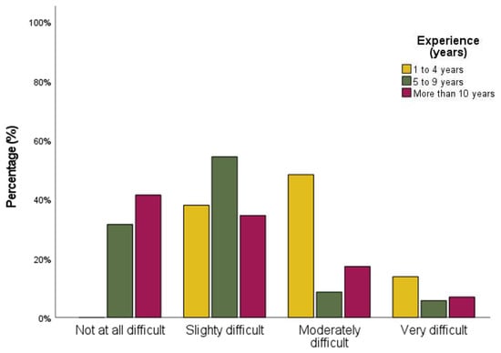 Bar graphs showing self-perceived difficulty in decision-making according to experience (years).
