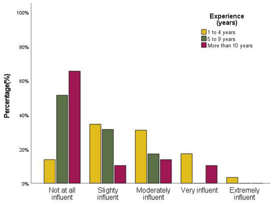 Bar graph showing self-perceived supervisor’s influence on decision-making according to experience (years).