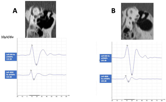 CT scan finding of two patients that shows a left definite dehiscence (A) and left near-dehiscence (B) with the corresponding oVEMP findings at 0.5 kHz and 4 kHz air-conducted sound stimulating each ear.