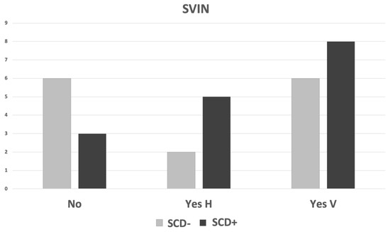 We first analyzed SVIN to detect SCD in patients (groups SCD and SCD+) and we found that the specificity of the SVIN to detect a patient with SCD is 0.43 and its sensitivity is 0.81: the positive predictive value is 0.62 and the negative predictive value is 0.67. In a more detailed way, we then searched for the type of nystagmus, and the CT scan findings and results are shown in Figure 2. There is no association between SVIN detection and SCD group (chi-square = 4.438, p = 0.108) when all SCD are considered (both uni- and bilateral patients).