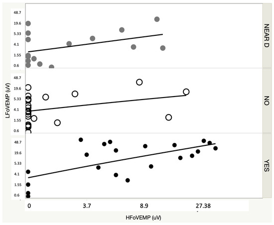 The mean amplitude of the n10-p16 response was 1 ± 1.6 µV in the group in which the response was considered doubtful and 11.9 ± 8.6 µV in the group in which the response was considered positive. In Figure 3, we present the amplitude of the HFoVEMP to the result obtained in the 0.5 kHz OVEMP (LFoVEMP) with regard to the finding in the CT scan.