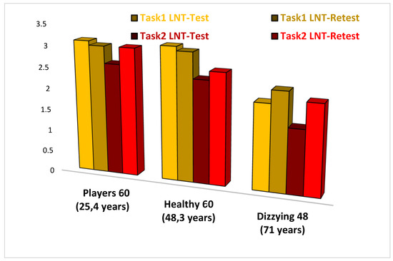 - GR1 (Dizzy subjects): scores 2 and 2.3, respectively, for the LNT yellow-colored path test and re-test; scores 1.5 and 2.1, respectively, for the LNT red-colored path test and re-test;