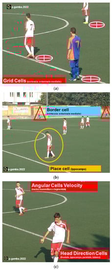 Our data support the concept that during one’s movement in space, both in healthy and/or sports subjects, the CNS updates the self-position by acquiring plenty of visual reference points, in combination with proprioceptive feedback and memorized pre-programmed motor control [32,33,34,35,36,37]. In the vestibular patient, when external landmarks are negated, CNS integration processes could lead to misinterpretation of both direction and position between body and objects, causing loss of balance. In fact, in the CNS, four types of cells allow interpretation and decoding of the visual and spatial information at any age and in any condition of physical training: the “Grid Cells”, the “Border Cells”, the “Head-Directions Cells”, and the “Angular-Velocity Cells”. Improving their functional integration through NAT and NAT 2.0 training means developing better cognitive control of the situational setting, better spatial orientation, easier navigation, better motor control, and better balance. In a football match, as well as in every daily life activity, the mentioned cells interact actively instant by instant in order to decode and memorize all environmental information, static and dynamic properties of objects in the visual field, and body motion perception (Figure 4). Cognitive deficits, such as poor concentration or short-term memory loss due to neurological dysfunctions, are frequent among patients with vestibular disorders, especially with old age, causing disorientation, imbalance, and falls [38]. On the contrary, damage to the vestibular system inevitably leads to cognitive deficits in learning, visual and spatial memory, with consequent VWM and SWM deficits, altered self-perception of position in space, reduced navigation, and loss of balance [39]. By means of the NAT 2.0 program, the possibility to obtain and quantify the visuo-spatial abilities (VWM and SWM) based on a series of sports and trained subjects, compared to those of healthy non-sports subjects, becomes extremely important for planning vestibular rehabilitation [40].