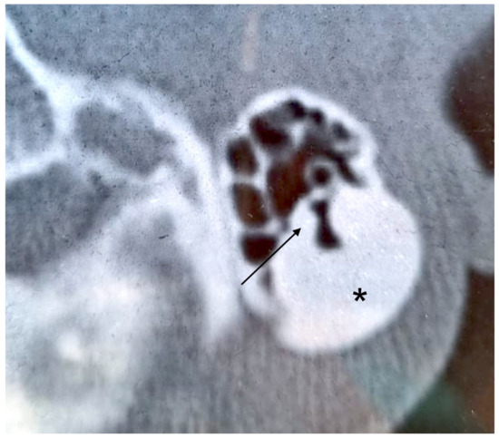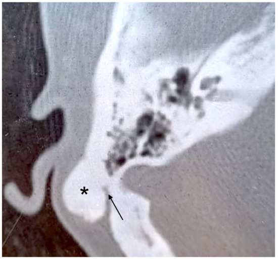 Axial CT scan. Left mastoid cortex osteoma (asterisk) with trabeculae in the deepest component (arrow).
