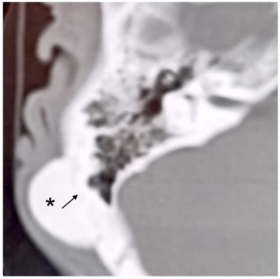 Axial CT scan. Right mastoid cortex osteoma (asterisk) with a subtle line margin (arrow).